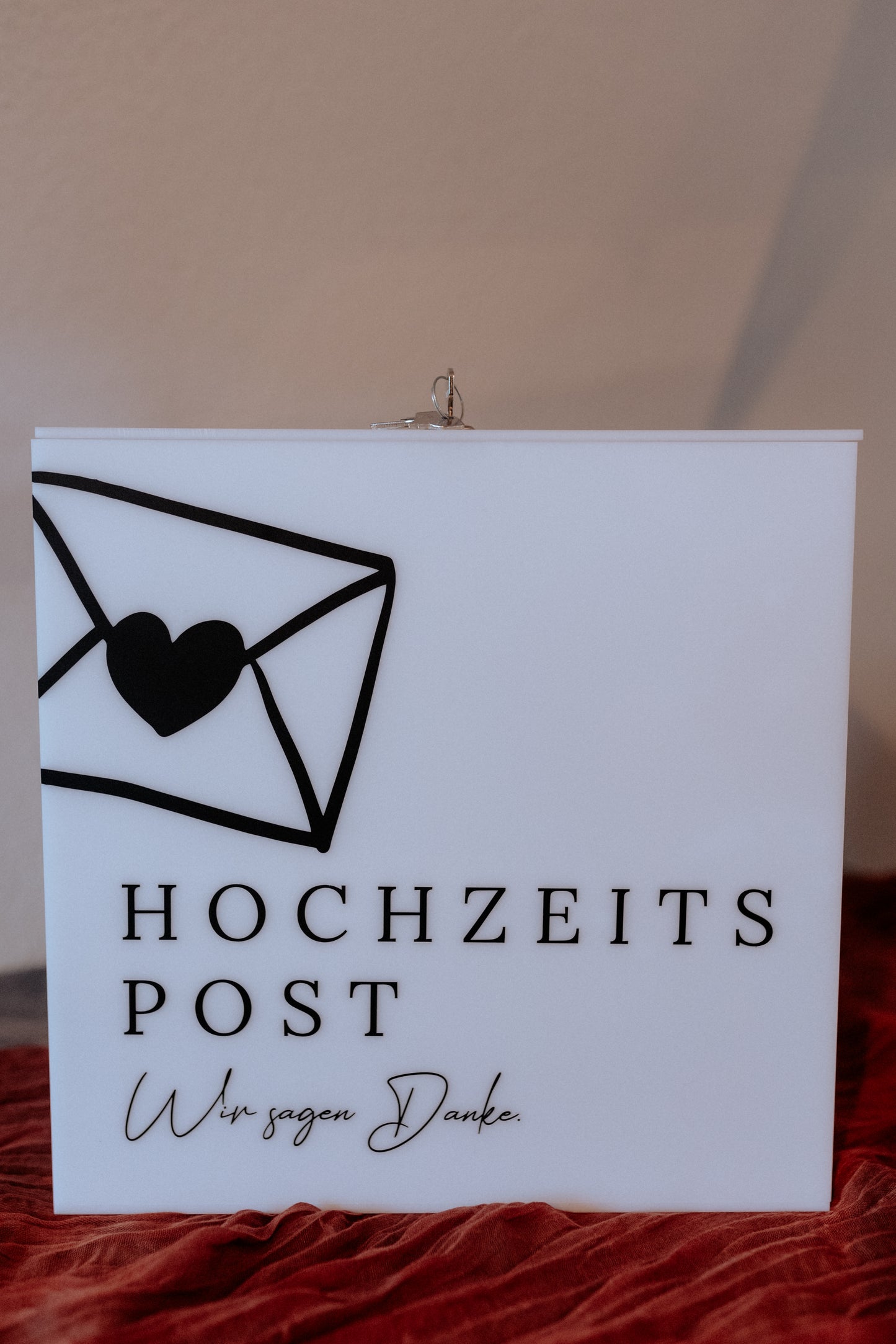 Die Hochzeitsbox Kaya ist die perfekte Lösung, um Briefe, Karten und Glückwünsche stilvoll und sicher aufzubewahren. In edlem Weiß mit eleganten schwarzen Akzenten fügt sie sich harmonisch in jede Hochzeitsdekoration ein. Ob am Geschenktisch oder Eingangsbereich – Kaya ist nicht nur praktisch, sondern auch ein stilvoller Hingucker. Der Plott kann optisch nicht angepasst werden.