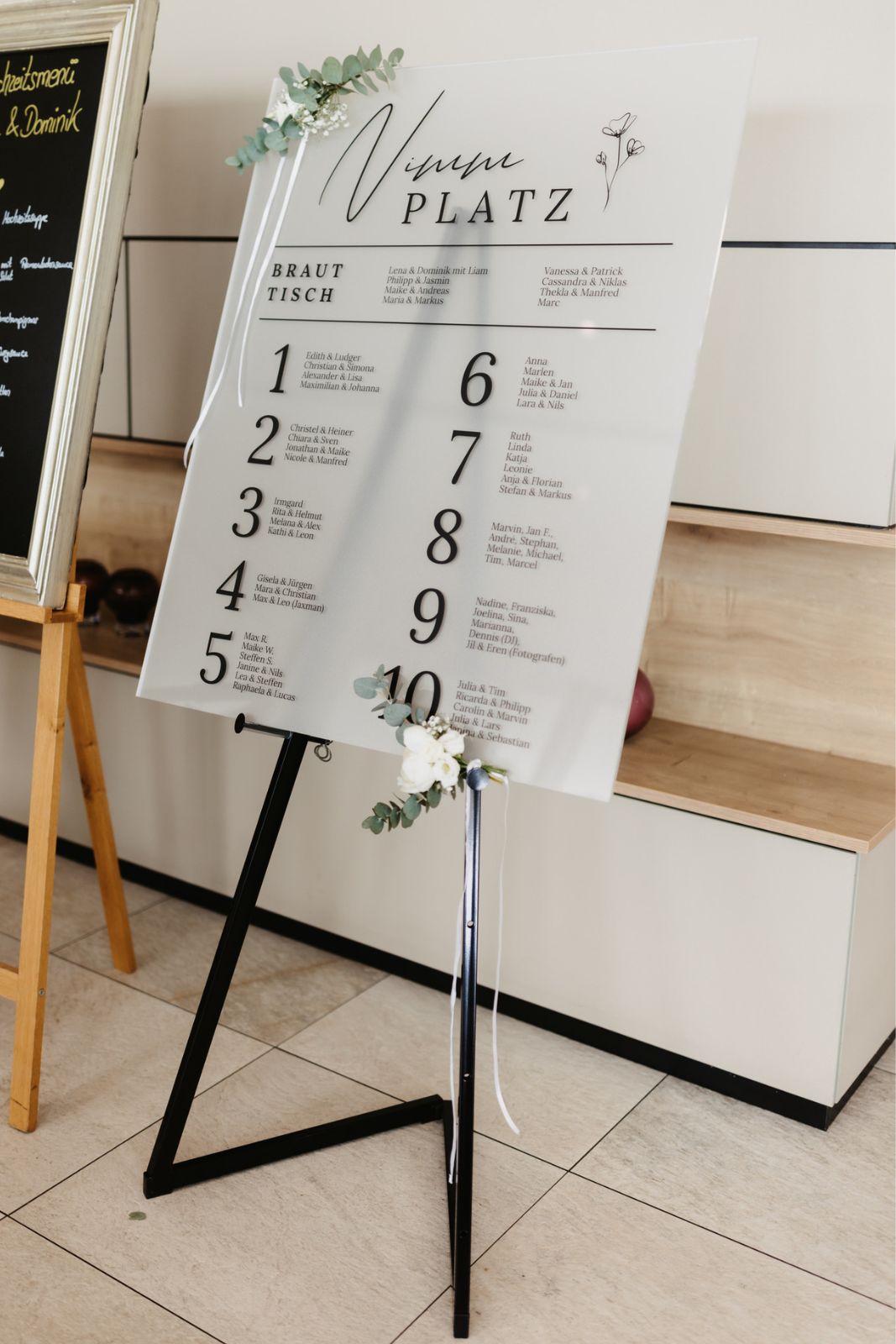 Ein zeitlos elegantes Design aus satiniertem Acryl, das durch seine schlichte, moderne Ästhetik glänzt. Mit den individuell geplotteten Namen eurer Gäste und der Tischordnung wird der Sitzplan zu einem einzigartigen Blickfang, der für Klarheit und Eleganz sorgt.
