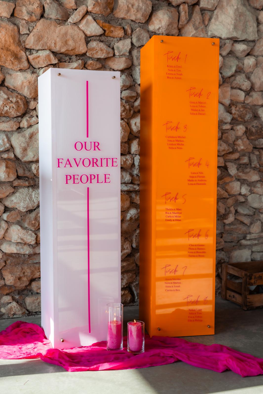Auf jeder Säule sitzt eine hochwertige Acrylplatte, die individuell mit euren Gästelisten oder Tischnummern beschriftet wird – ganz nach euren Wünschen. Gegen einen kleinen Aufpreis übernehmen wir für euch auch gerne die komplette Beschriftung – passend zu eurem Eventstil und Farbkonzept.