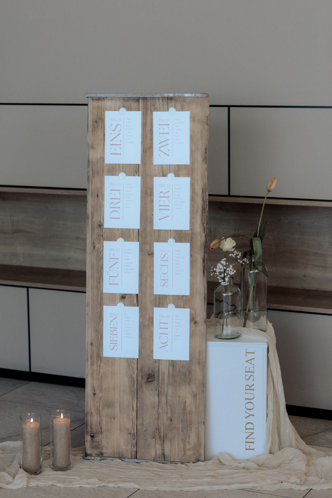 Unser Sitzplan “Marielle“ vereint rustikales Design mit eleganten Details. Die hochwertige Schaltafel wird mit individuell gestaltbarer Papeterie versehen, die mit edlen Wachsplättchen befestigt sind.