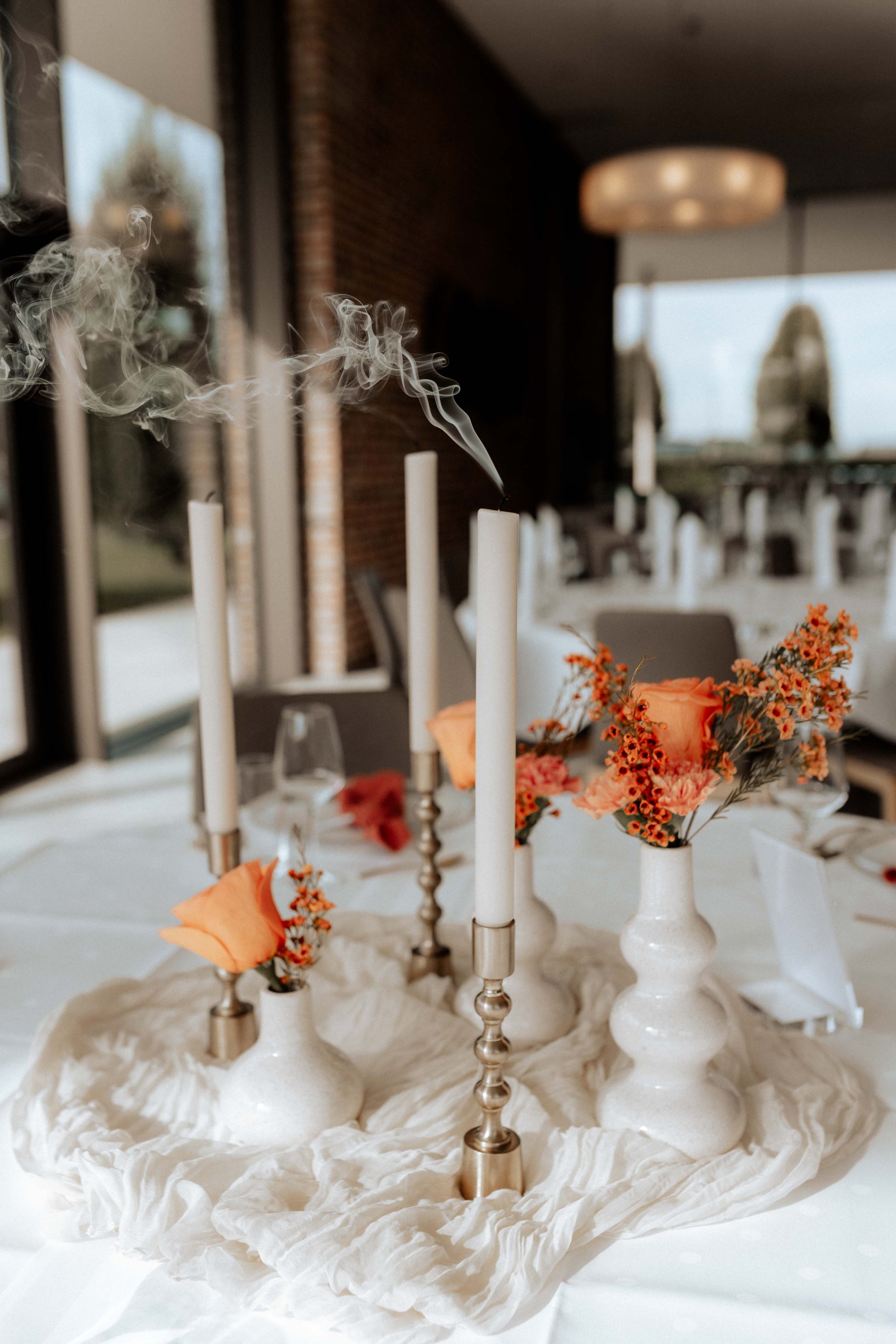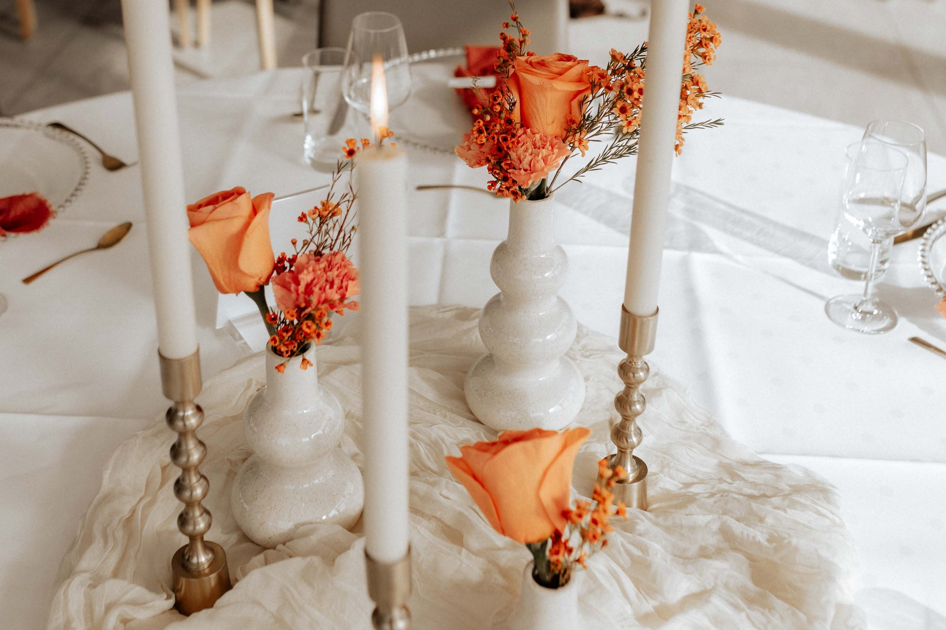 Das 3er-Set in eleganten Beige- und Weißtönen ist der Inbegriff von schlichter Schönheit und Vielseitigkeit. Mit ihrem zeitlosen Design passen sie sich mühelos nahezu jeder Farbgebung und Hochzeitsdekoration an. Ob klassisch, modern oder rustikal – diese Vasen harmonieren perfekt mit jeder Farbpalette und setzen sowohl Blumen als auch andere Dekoelemente stilvoll in Szene. Ein hochwertiges und flexibles Dekorationselement, das eure Hochzeitstische auf elegante Weise bereichert. Die Vasen sind im Set, sowie auch einzeln erhältlich.